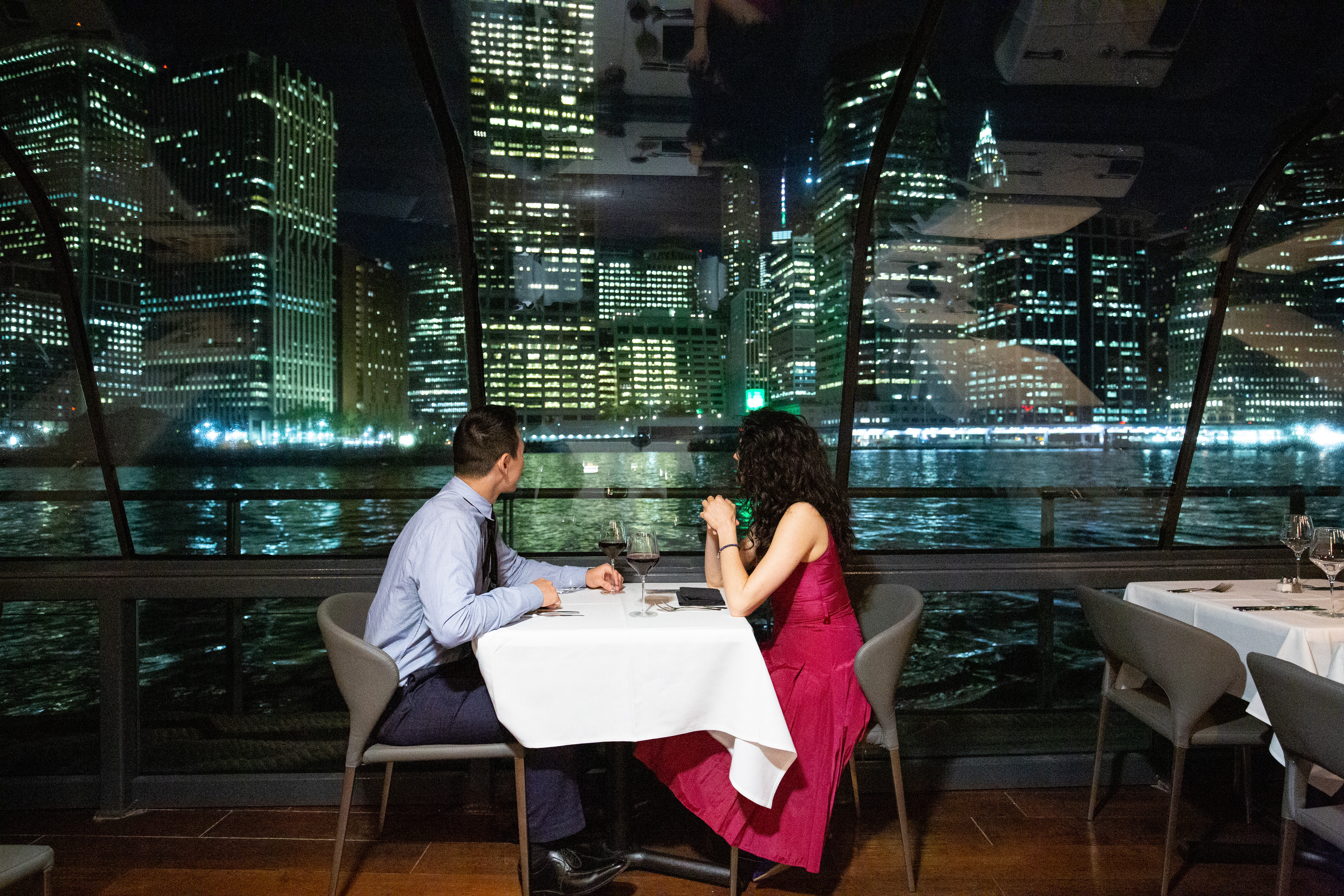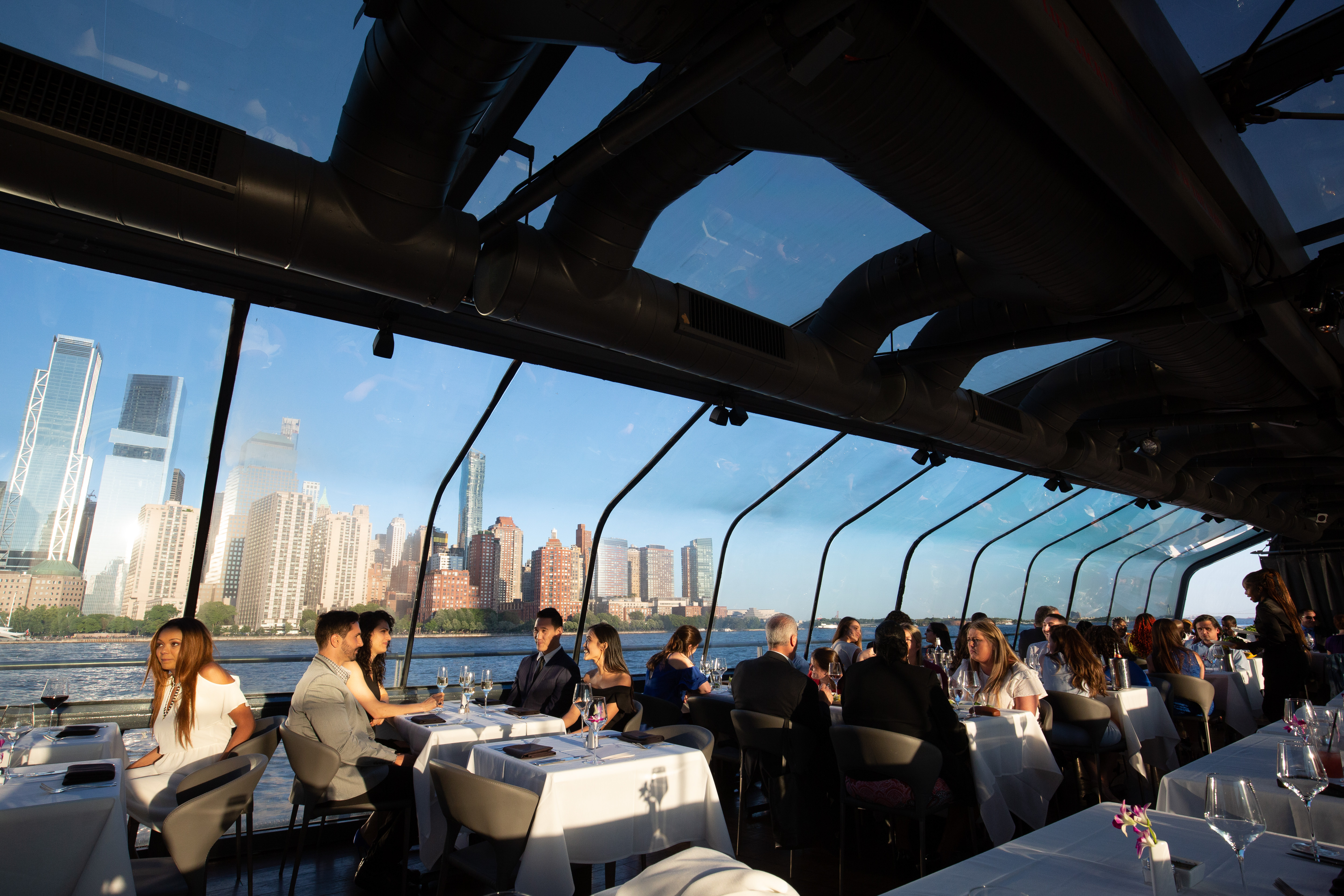 The most elegant way to do NYC at night. Dine aboard a sleek, glass-enclosed vessel with panoramic skyline views, a refined atmosphere, and a true “special occasion” feel from start to finish.